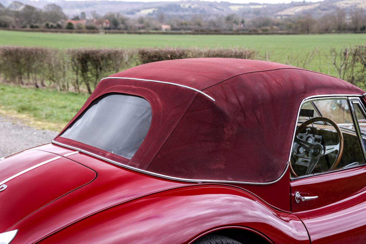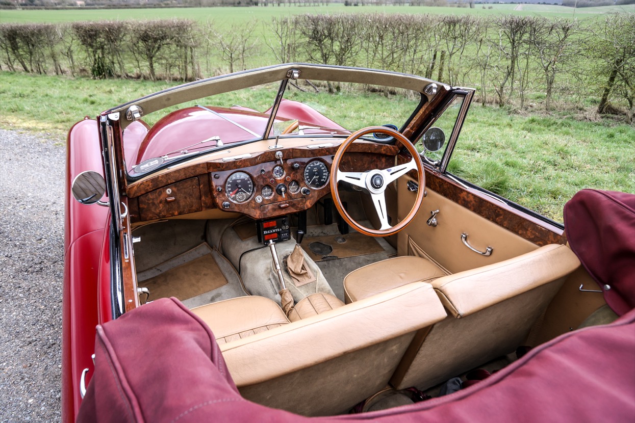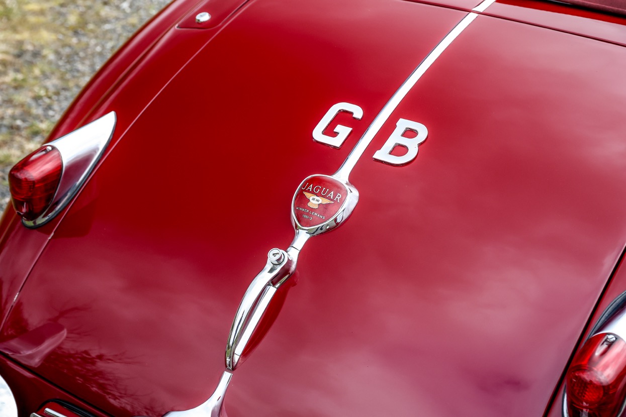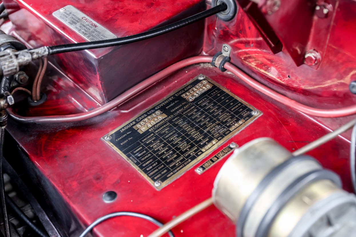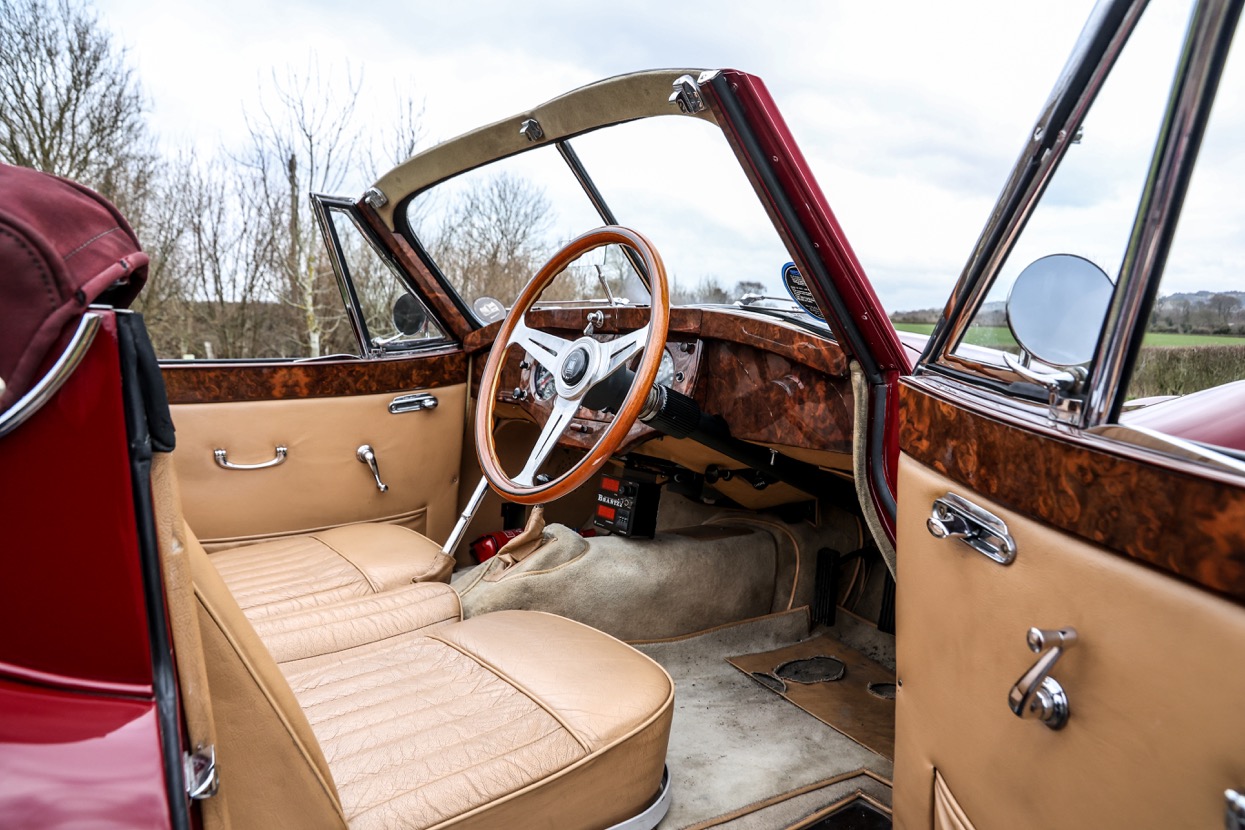 The Jaguar XK140 Drop Head Coupe upgraded to 3.8 litre offered here at Autostorico was first registered on 14th December 1955 as 156JRF ‘Chassis No: 807248.’ Supplied new by Hewitts Garage, Stourbridge to its first owner Mr Thomas Nicklin of Stourbridge, Worcestershire, this genuine home market car is finished in Regency Red with Tan leather interior. This stunning example has been fully restored and sympathetically upgraded by marque specialist Twyford Moors Jaguar. Works included a bare metal respray, mechanical overhaul along with fitting a five-speed gearbox for more relaxed high speed touring. Other features include an Alloy radiator along with header tank, Kenlowe fan, upgraded starter motor, 16” chrome wire wheels, Nardi wood rim steering wheel with power steering, front and rear disc brake conversion, Unleaded fuel cylinder head ported and polished, alternator conversion, battery cut off switch, full stainless steel exhaust system and fitted luggage.