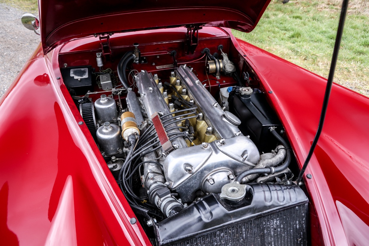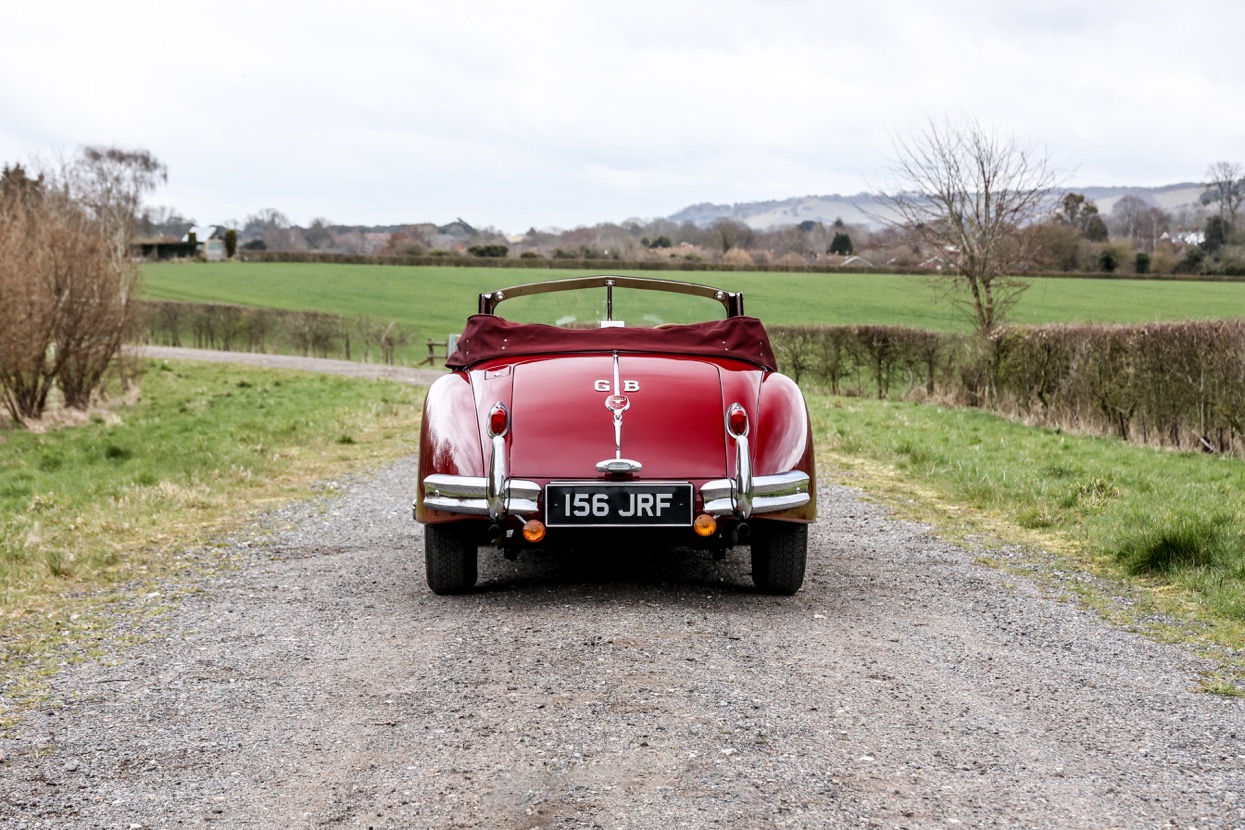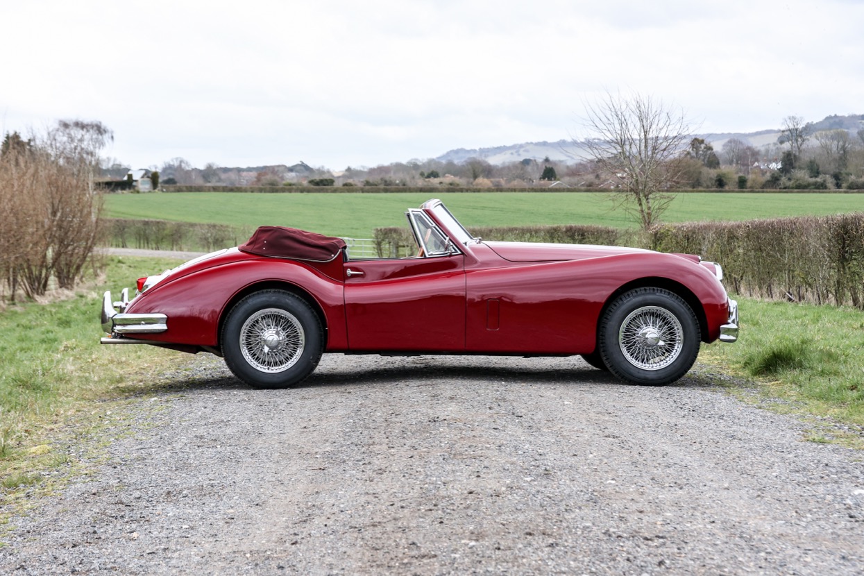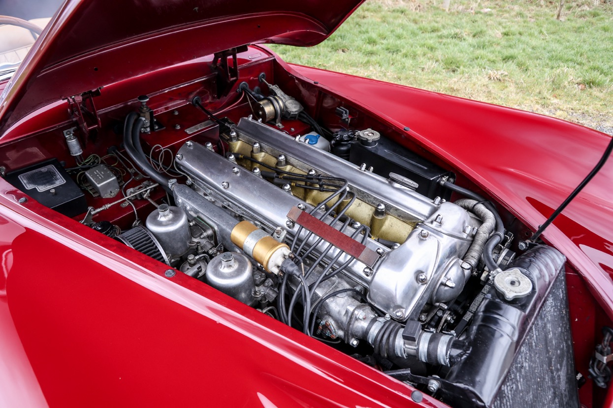 The Jaguar XK140 Drop Head Coupe upgraded to 3.8 litre offered here at Autostorico was first registered on 14th December 1955 as 156JRF ‘Chassis No: 807248.’ Supplied new by Hewitts Garage, Stourbridge to its first owner Mr Thomas Nicklin of Stourbridge, Worcestershire, this genuine home market car is finished in Regency Red with Tan leather interior. This stunning example has been fully restored and sympathetically upgraded by marque specialist Twyford Moors Jaguar. Works included a bare metal respray, mechanical overhaul along with fitting a five-speed gearbox for more relaxed high speed touring. Other features include an Alloy radiator along with header tank, Kenlowe fan, upgraded starter motor, 16” chrome wire wheels, Nardi wood rim steering wheel with power steering, front and rear disc brake conversion, Unleaded fuel cylinder head ported and polished, alternator conversion, battery cut off switch, full stainless steel exhaust system and fitted luggage.