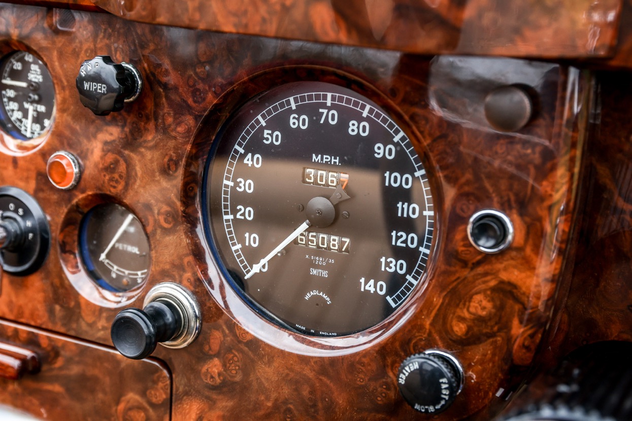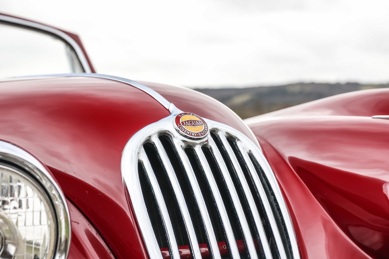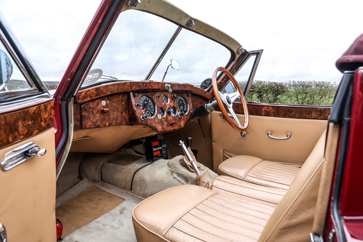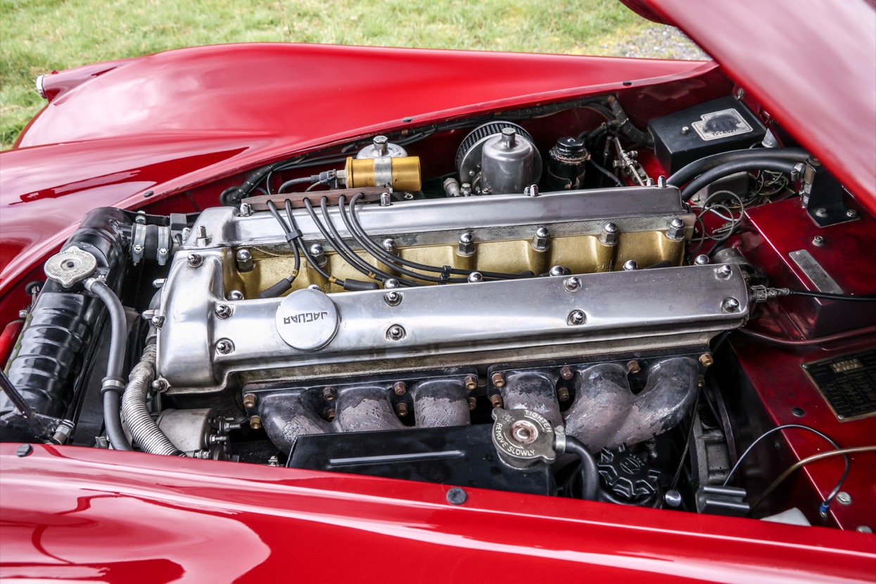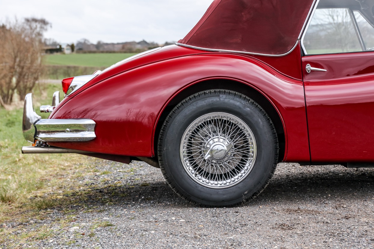 The Jaguar XK140 Drop Head Coupe upgraded to 3.8 litre offered here at Autostorico was first registered on 14th December 1955 as 156JRF ‘Chassis No: 807248.’ Supplied new by Hewitts Garage, Stourbridge to its first owner Mr Thomas Nicklin of Stourbridge, Worcestershire, this genuine home market car is finished in Regency Red with Tan leather interior. This stunning example has been fully restored and sympathetically upgraded by marque specialist Twyford Moors Jaguar. Works included a bare metal respray, mechanical overhaul along with fitting a five-speed gearbox for more relaxed high speed touring. Other features include an Alloy radiator along with header tank, Kenlowe fan, upgraded starter motor, 16” chrome wire wheels, Nardi wood rim steering wheel with power steering, front and rear disc brake conversion, Unleaded fuel cylinder head ported and polished, alternator conversion, battery cut off switch, full stainless steel exhaust system and fitted luggage.