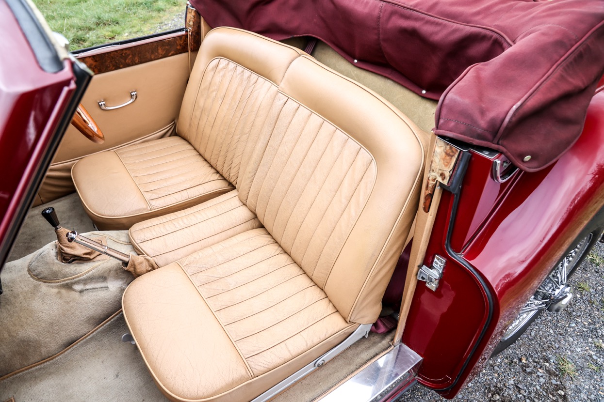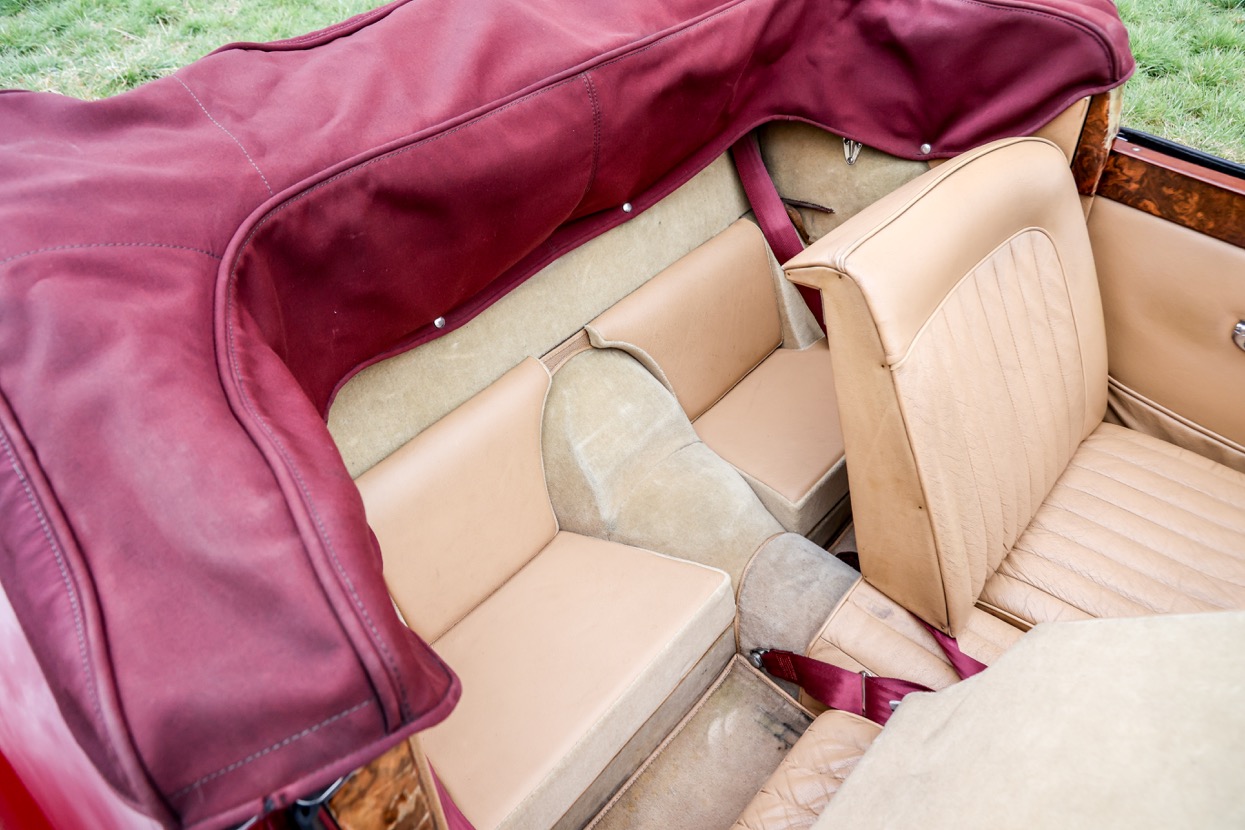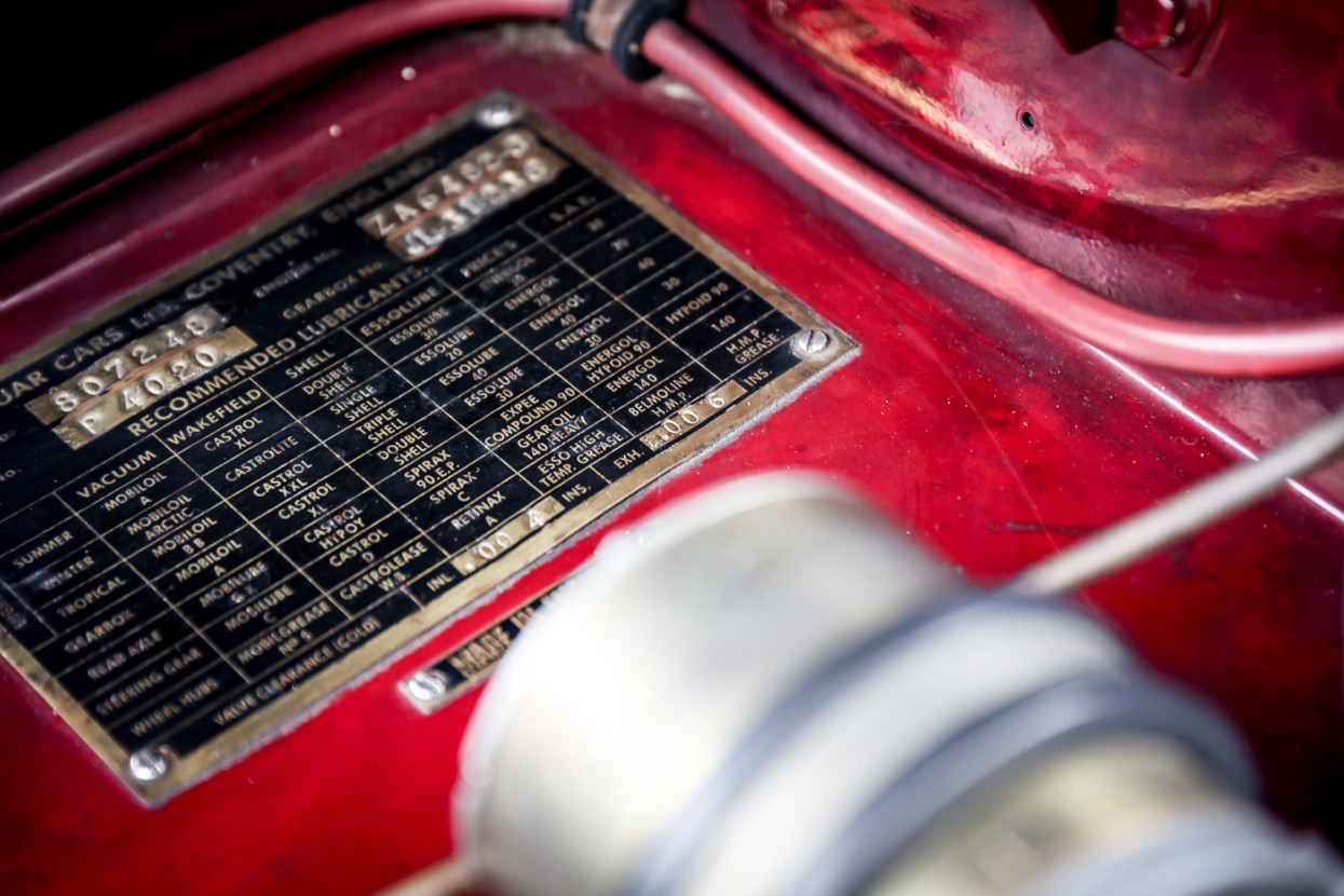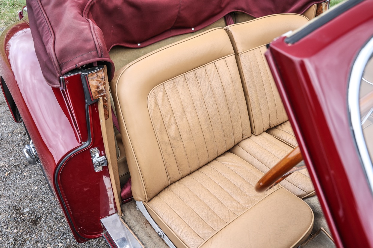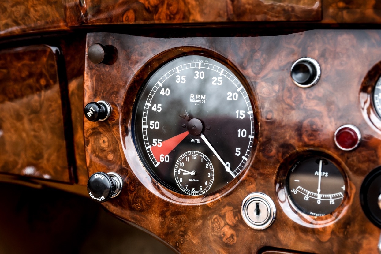 The Jaguar XK140 Drop Head Coupe upgraded to 3.8 litre offered here at Autostorico was first registered on 14th December 1955 as 156JRF ‘Chassis No: 807248.’ Supplied new by Hewitts Garage, Stourbridge to its first owner Mr Thomas Nicklin of Stourbridge, Worcestershire, this genuine home market car is finished in Regency Red with Tan leather interior. This stunning example has been fully restored and sympathetically upgraded by marque specialist Twyford Moors Jaguar. Works included a bare metal respray, mechanical overhaul along with fitting a five-speed gearbox for more relaxed high speed touring. Other features include an Alloy radiator along with header tank, Kenlowe fan, upgraded starter motor, 16” chrome wire wheels, Nardi wood rim steering wheel with power steering, front and rear disc brake conversion, Unleaded fuel cylinder head ported and polished, alternator conversion, battery cut off switch, full stainless steel exhaust system and fitted luggage.