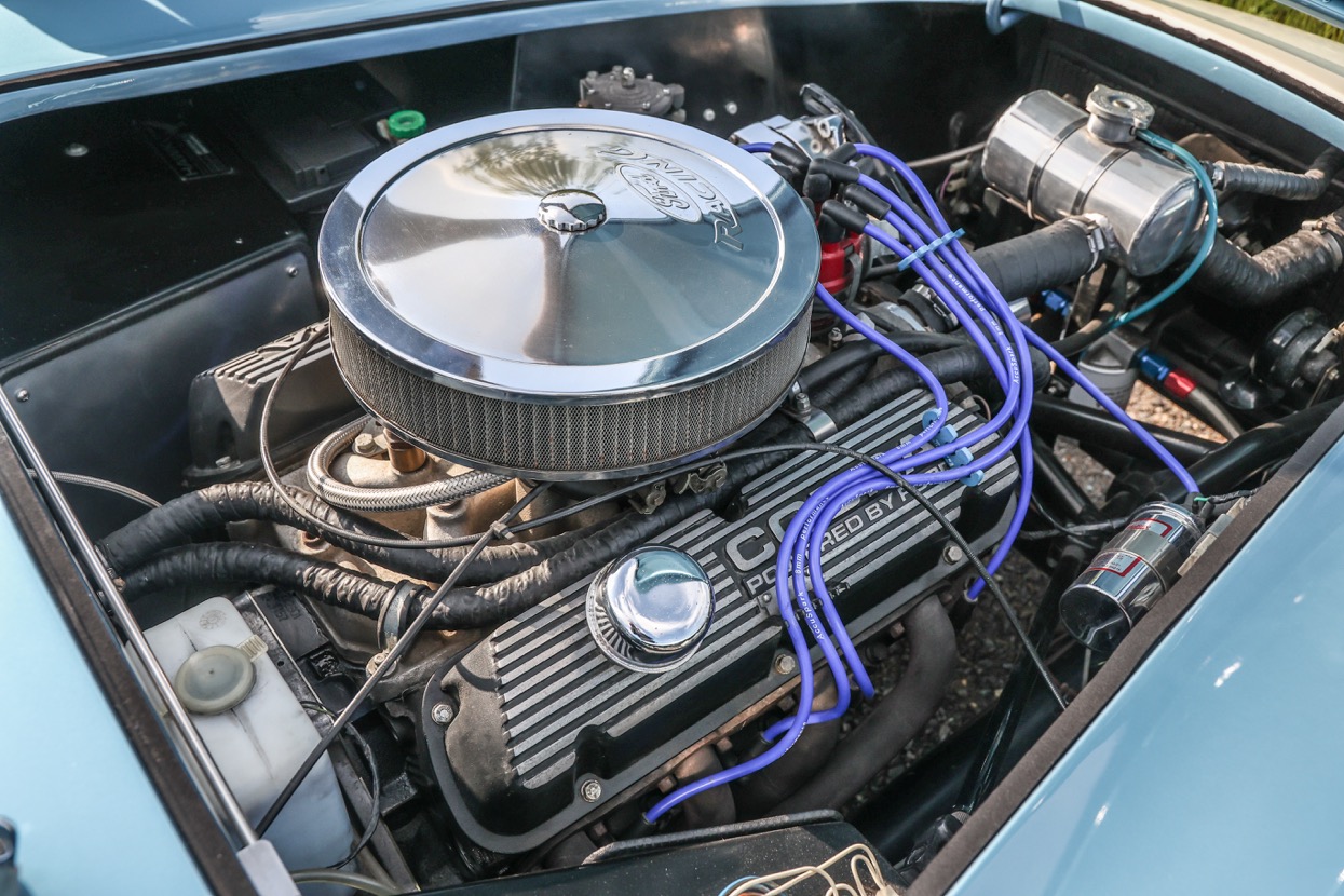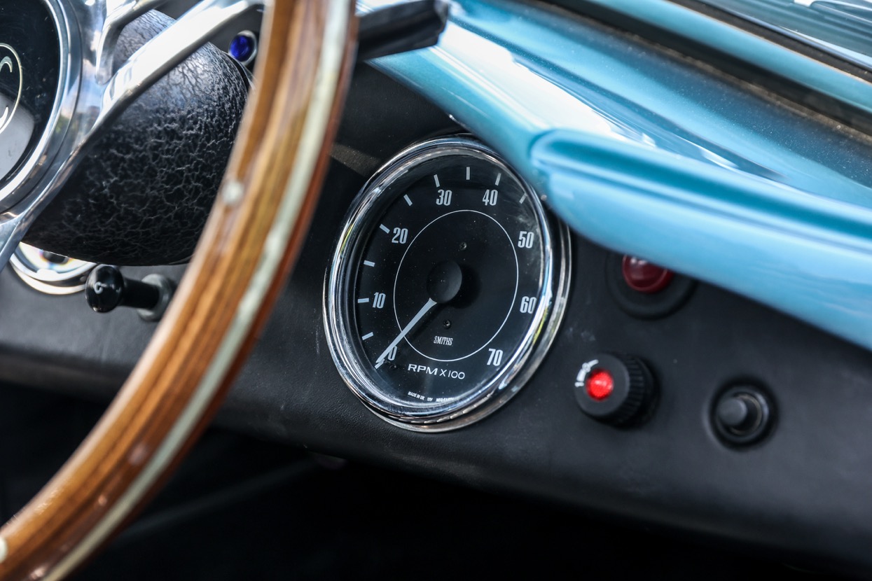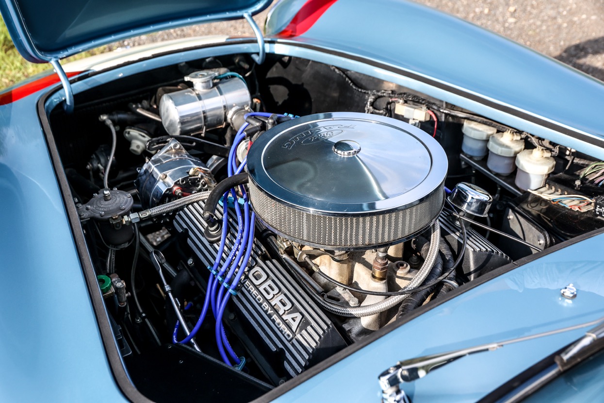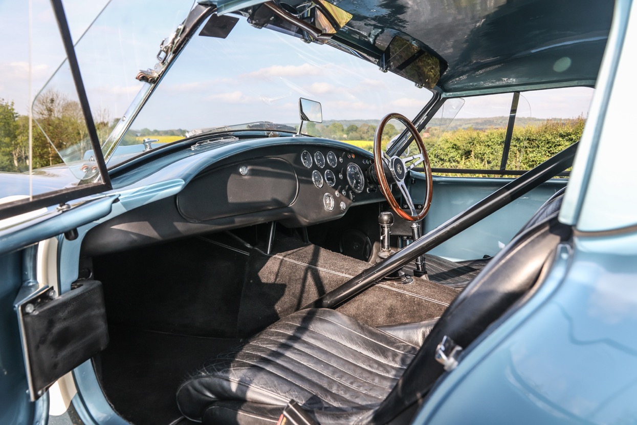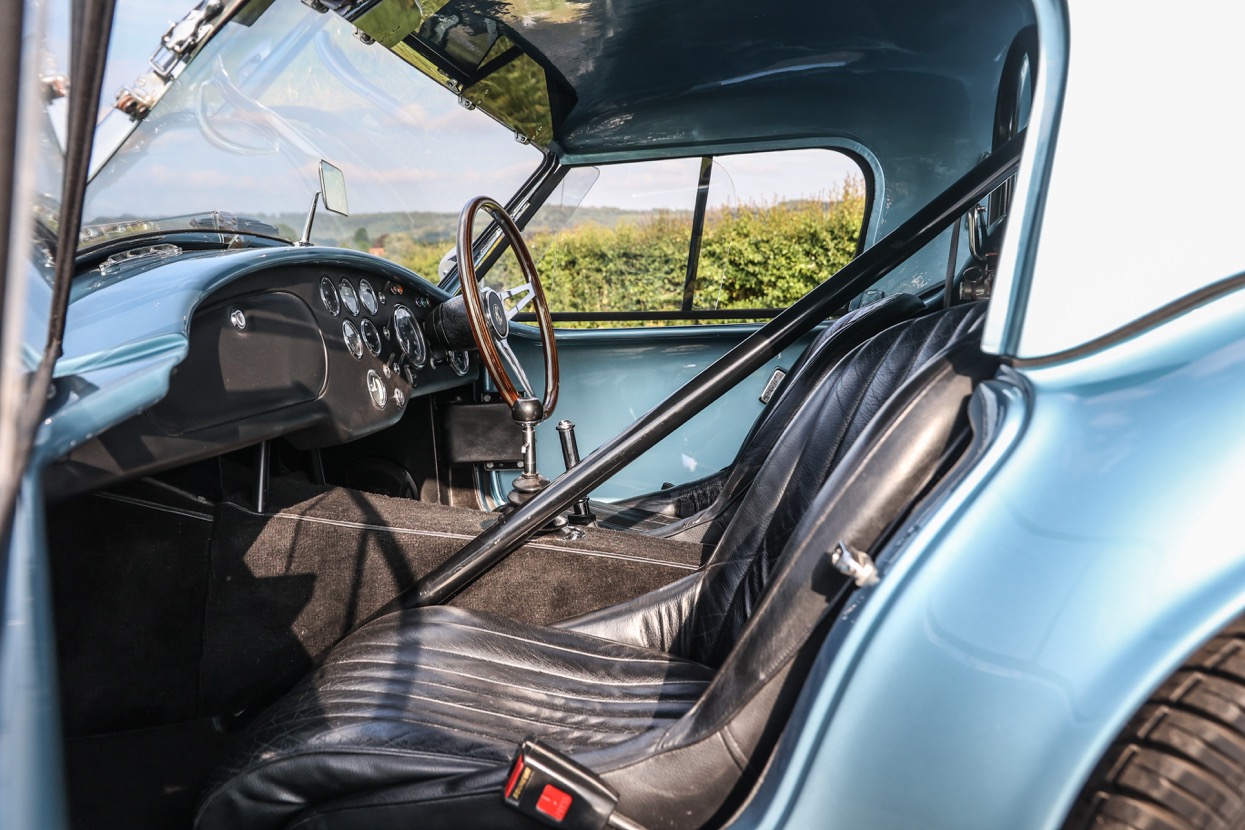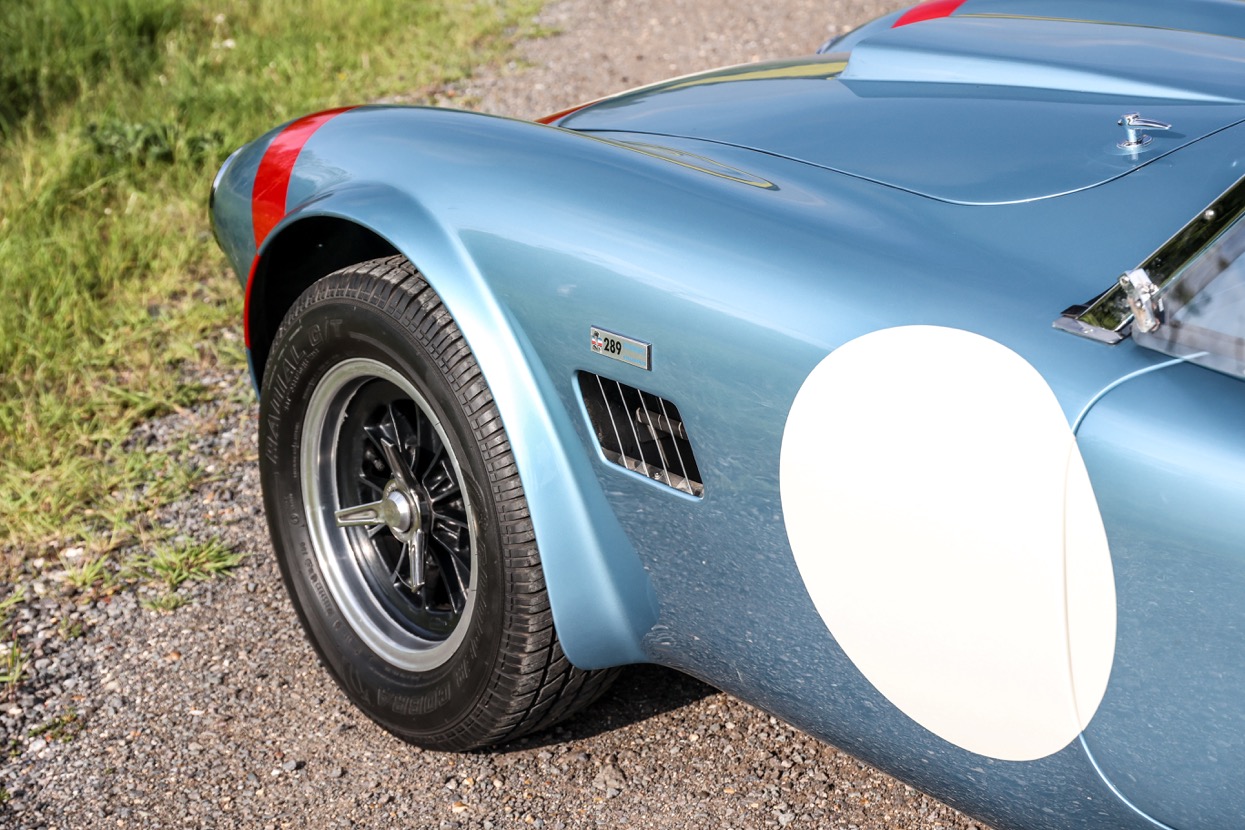 The AC Cobra 289 FIA Evocation by Hawk offered at Autostorico is a 2003 Registered example. This outstanding example is powered by a Ford 5.0 Litre V8 with an Edelbrook carburettor, E Type rear axle and Pan air filter. Finished in period Viking Blue Blue with a Red stripe and Black leather interior trim. Specification highlights include removable hard top, side screens, Aluminium wing mirrors 15” Halibrand wheels with knock off spinners, Five speed gearbox and immobiliser. The interior is complemented by period Smiths dials, waist harnesses and period fire extinguisher.