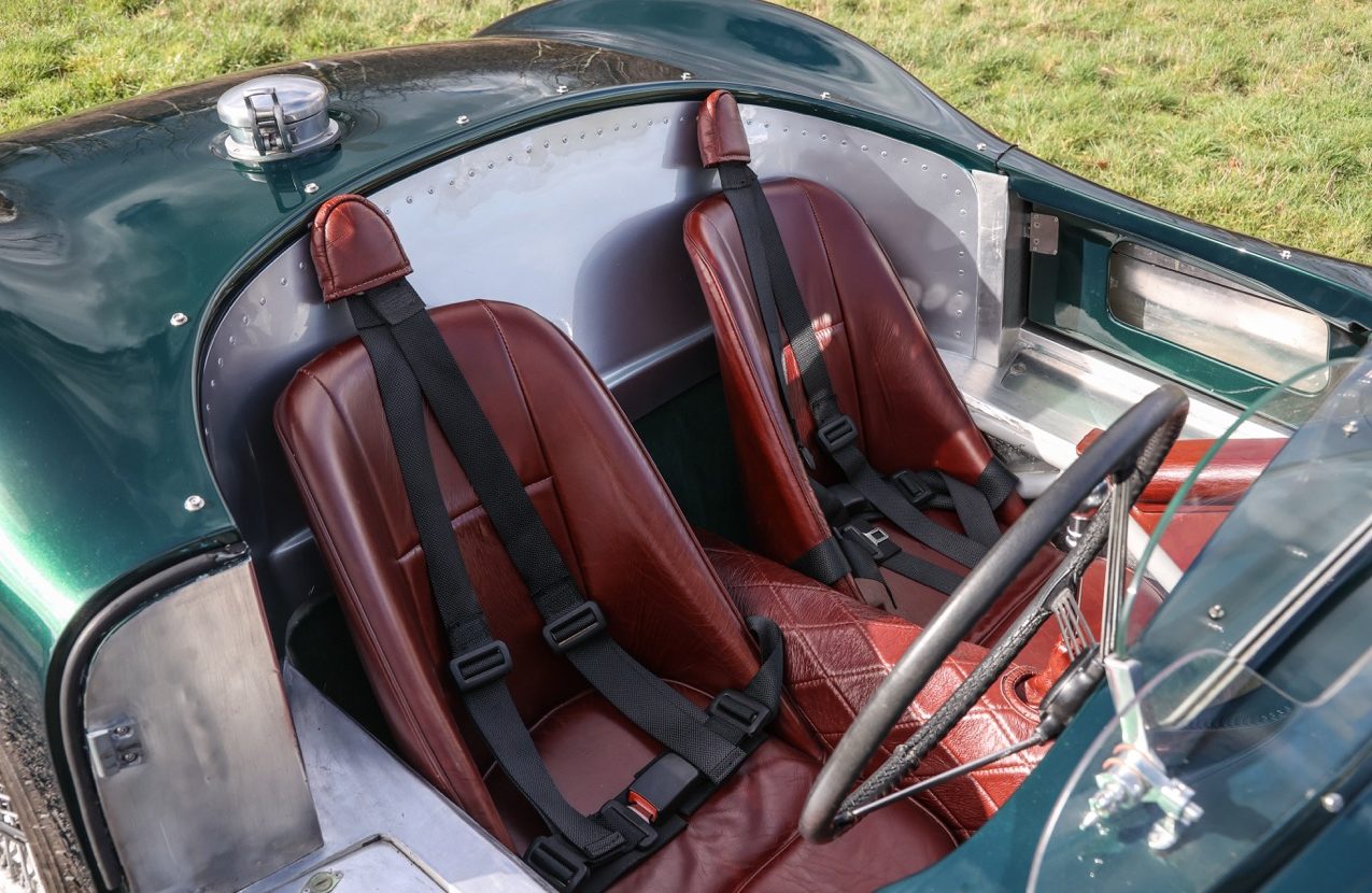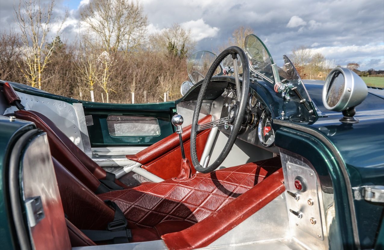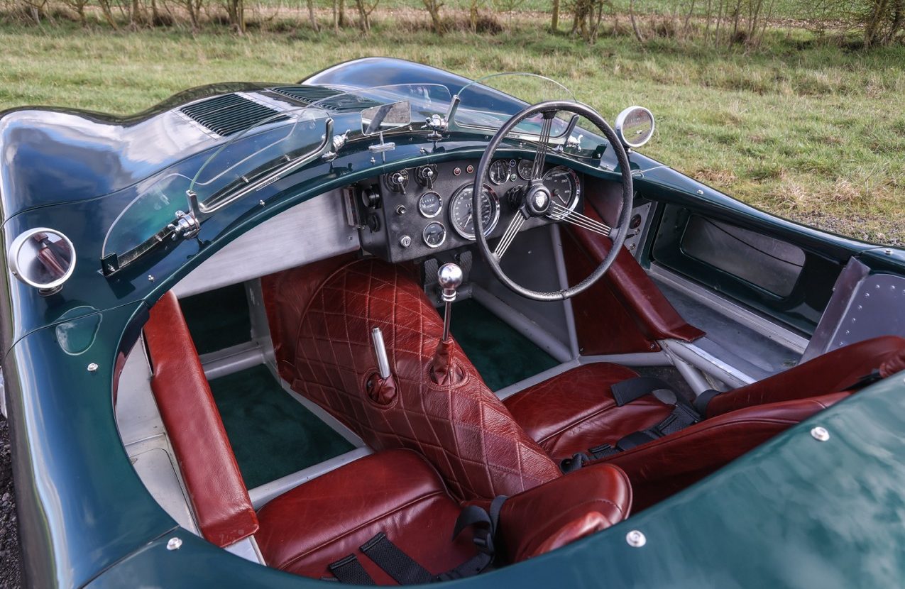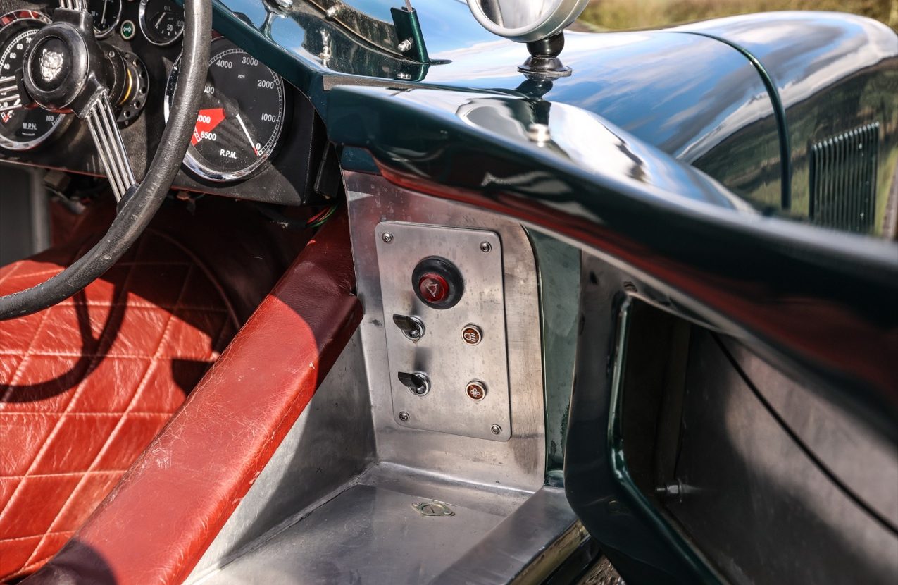 Built around a fully bracketed tubular steel space frame, similar to the original car with floor and bulkhead panels riveted together. The GRP bodywork houses a Le Mans style fuel filler. The windscreens fitted offer a full wrap around Perspex screen with Mille Miglia cut outs and twin Brooklands “Aero” type screens behind. Powered by a 4.2 litre, straight six, XK series engine built to fast road specification.