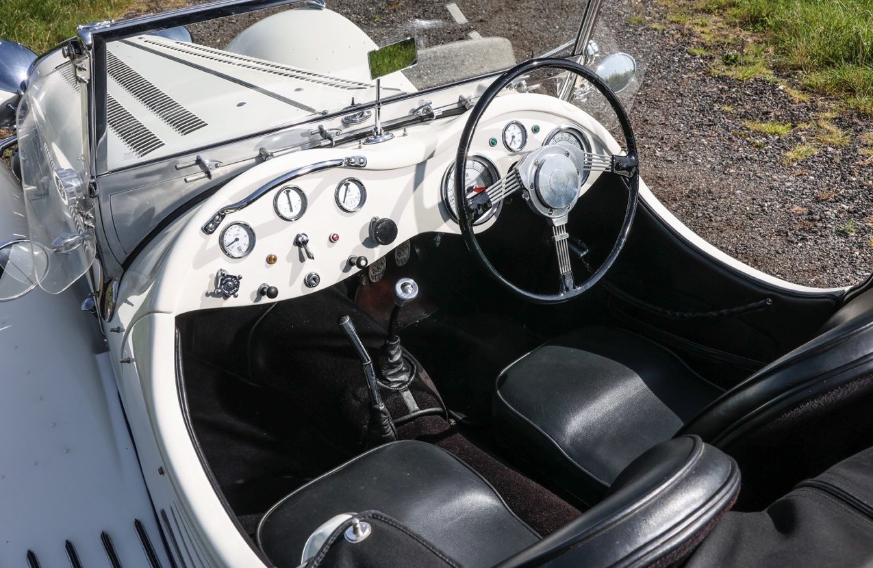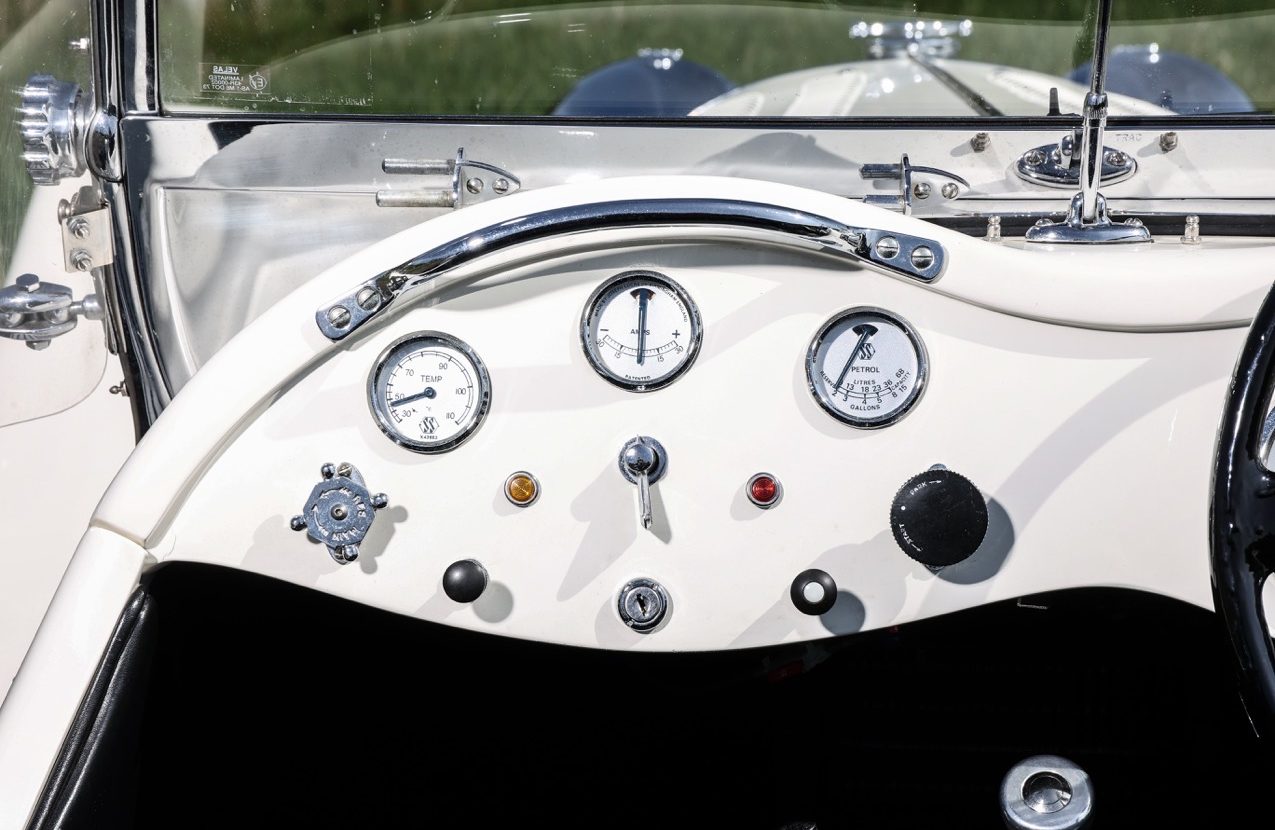 The Jaguar SS100 Evocation by Suffolk Sports Cars offered here at Autostorico is finished in Old English White with Black Bridge of Weir leather interior. This exceptional example was commissioned by its current owner in 2005 with the car passing its SVA/IVA test in 2009 meaning that its totally road legal, unlike many other Suffolk’s which use the donor cars identity. Having covered an indicated 19,534 miles this proven SS100 has undertaken several European tours including several trips to Classic Le-Mans. Power comes from a Jaguar 4.2 litre straight six-cylinder XK engine with HD8 SU carburettors mated to a manual gearbox with overdrive. Built with great attention to detail including decorative rivets along the front wings, period handbrake, Silverstone steering wheel and period dials. Other specification highlights include; luggage rack, wet weather gear, tonneau cover and concealed heater.