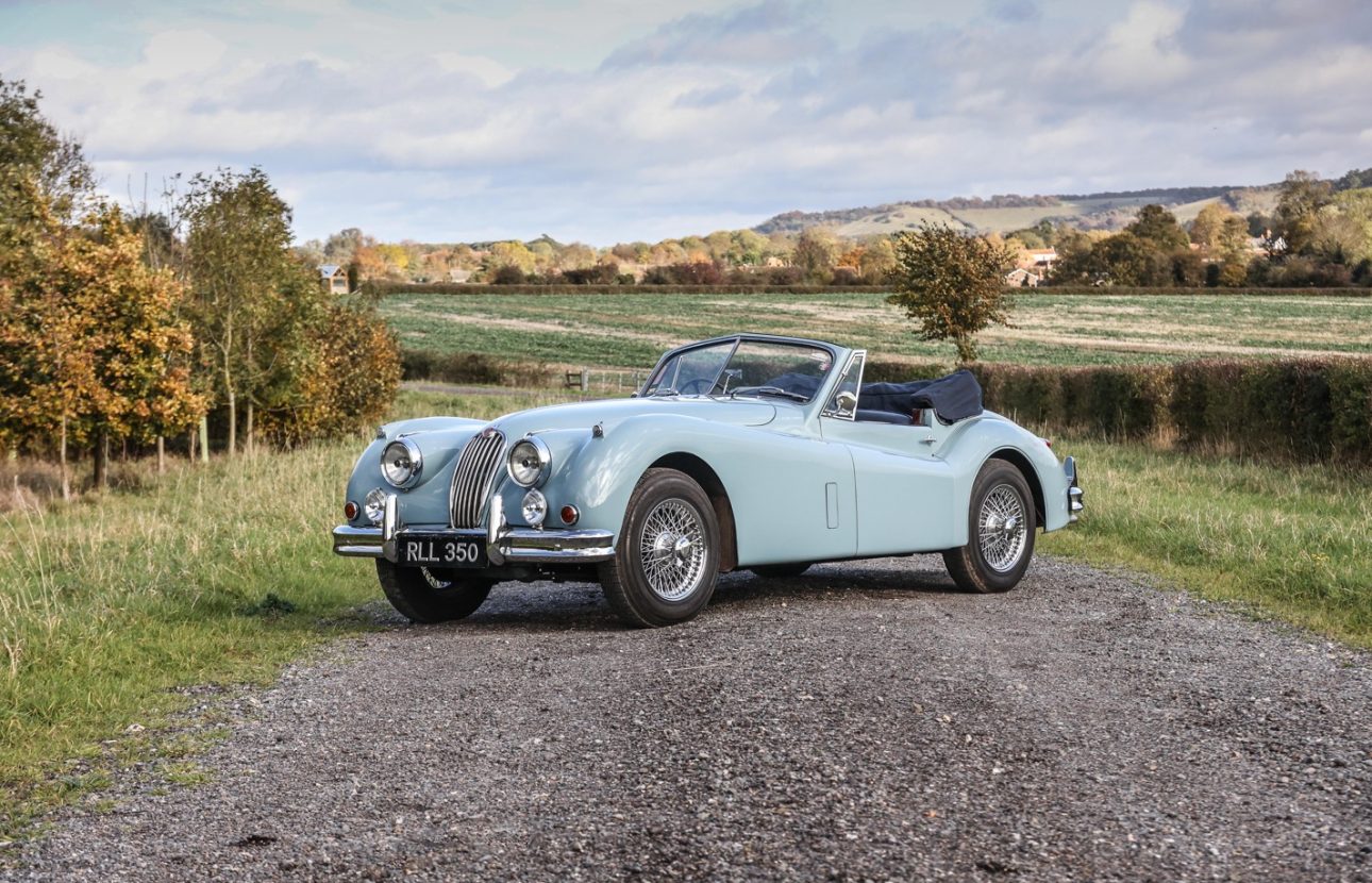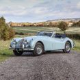 The Jaguar XK140 Drop head coupe offered here at Autostorico was first registered on 29th June 1955 as RLL350 ‘Chassis No: 807178.’ Supplied new by Ripco Ltd to its first owner Mr G Ferguson of Worthing Sussex, this genuine home market car is finished in its original Pastel Blue with Blue leather interior. Passing through a further three owners before being purchased by its current owner an avid Jaguar enthusiast and tourer in 2009. He undertook a no expense sparred restoration works included; Removing the engine and gearbox prior to a bare metal re-spray, The interior has been completely re-trimmed with new carpets and hood. The engine has undergone a complete rebuild and has been enhanced with the addition of electronic ignition and an alternator. A new five speed gearbox has been fitted to give more relaxed high-speed touring. Other work undertaken includes full re-wire, Front disc brakes fitted, Re-chromed, and new wire wheels and tyres.