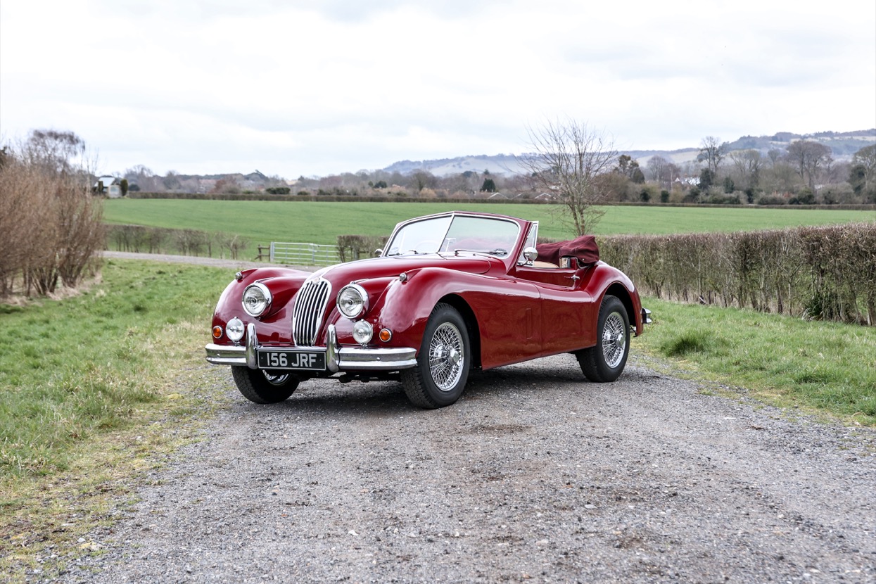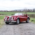 The Jaguar XK140 Drop Head Coupe upgraded to 3.8 litre offered here at Autostorico was first registered on 14th December 1955 as 156JRF ‘Chassis No: 807248.’ Supplied new by Hewitts Garage, Stourbridge to its first owner Mr Thomas Nicklin of Stourbridge, Worcestershire, this genuine home market car is finished in Regency Red with Tan leather interior. This stunning example has been fully restored and sympathetically upgraded by marque specialist Twyford Moors Jaguar. Works included a bare metal respray, mechanical overhaul along with fitting a five-speed gearbox for more relaxed high speed touring. Other features include an Alloy radiator along with header tank, Kenlowe fan, upgraded starter motor, 16” chrome wire wheels, Nardi wood rim steering wheel with power steering, front and rear disc brake conversion, Unleaded fuel cylinder head ported and polished, alternator conversion, battery cut off switch, full stainless steel exhaust system and fitted luggage.