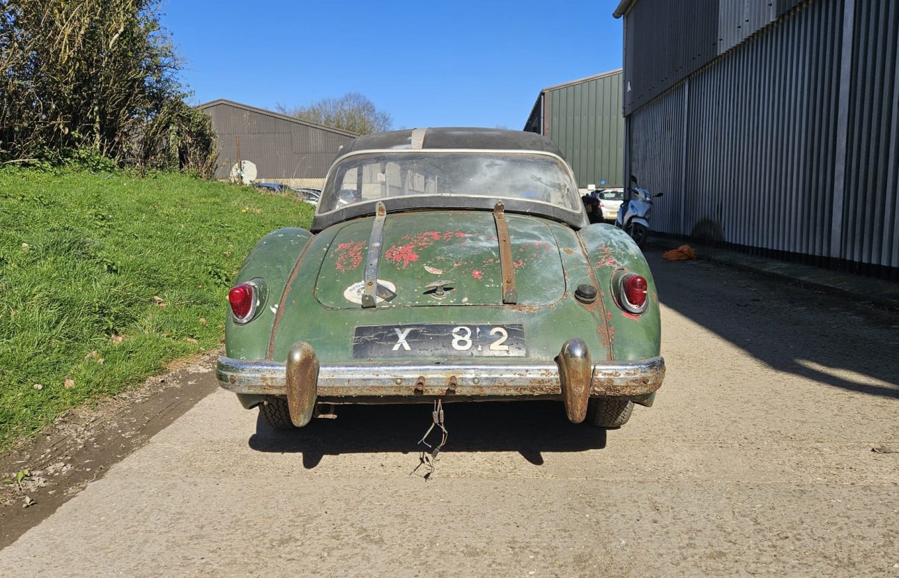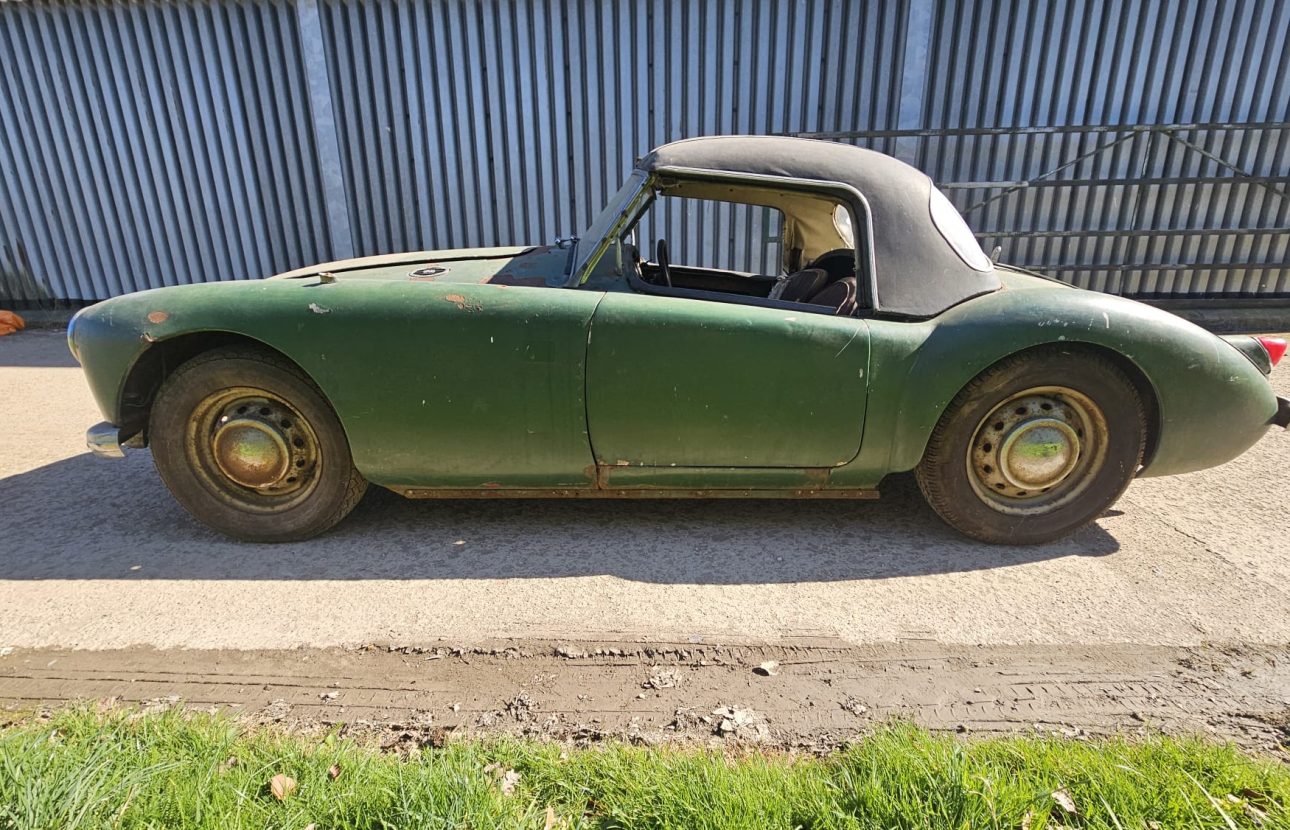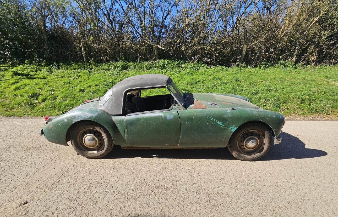 The vehicle appears substantially complete, presenting an exciting opportunity for an enthusiast or marque specialist to restore and return this elegant British sports car to its former glory.