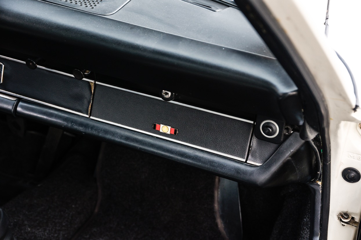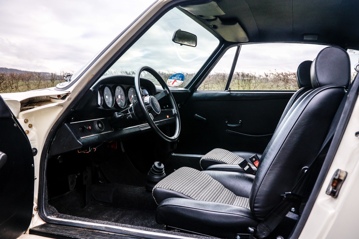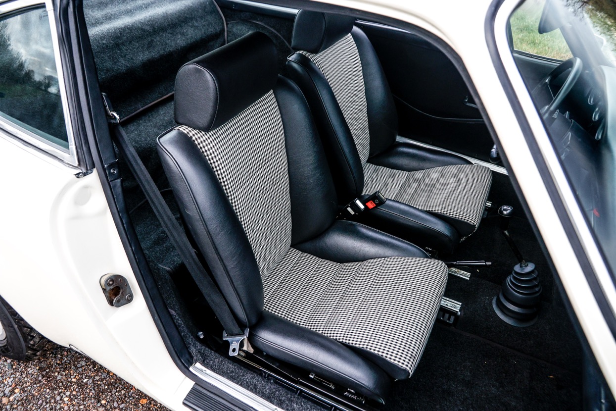 The Porsche 911 Carrera upgraded to 2.7 RS specification offered at Autostorico is finished in Grand Prix White with Black and White Houndstooth interior trim. First registered in France on 1st July 1973 the car remained in Europe where its Swiss competition passport confirms it competed in 2000 Hockenheim – Slalom Interlaken, 2000 Vareno race circuit at Vareno de’ Melegari in Italy and 2003 Hockenheim – Glodpokal Rennan. The car was registered in the UK in 2008 (being issued with the correct 1973 dated L plate). Passing through the hands of historic race enthusiast Ivan Dutton who competed in the car and had full HTP FIA papers class GTS22 issued. Specification highlights include Correct 2.7 litre RS 210bhp engine, Bosch 6-stamped mechanical fuel injection, 915 five speed gearbox Porsche Slite lsd; 7:31 final drive (4.43:1) Bilstein dampers. 7 and 8in Fuch alloy wheels.