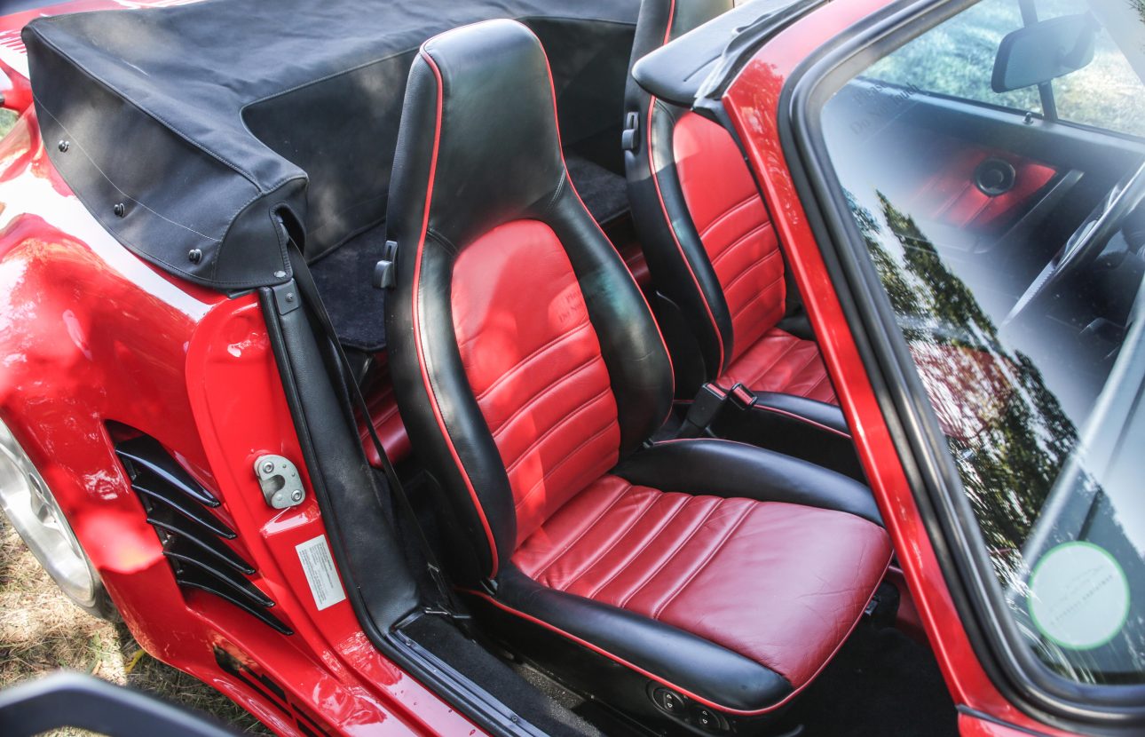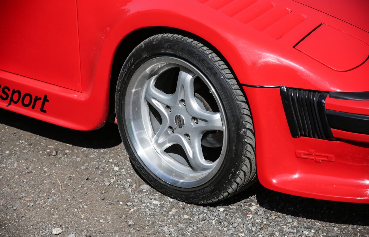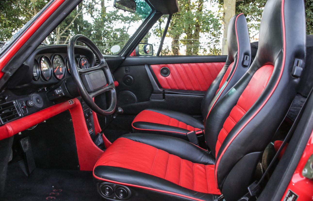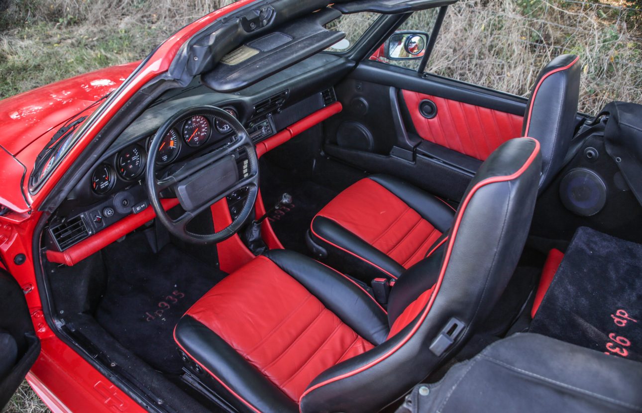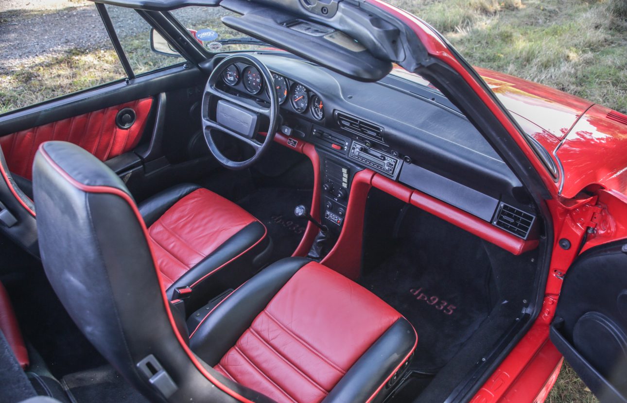 The Porsche DP935 3.2 Carrera Carrera Cabriolet ‘Flatnose’ by DP Motorsport offered here at Autostorico is a stunning 1988 example which is finished in the iconic combination of Guards Red with Black and Red leather. Supplied new by Porsche Cars North America to dealer Fred Opert Racing, who then immediately  sent 5 cars back to Germany to be converted. The original American number plate holder states it is 1 of 5 ( converted in 1988) and there are believed to be less than 10 convertibles worldwide. A plaque in the door shut confirms this to be a genuine DP conversion and is backed up with type written letters by Fred Opert racing. The works were carried out by Ekkehard, Zimmerman, GMBH and company KQ in June 1988