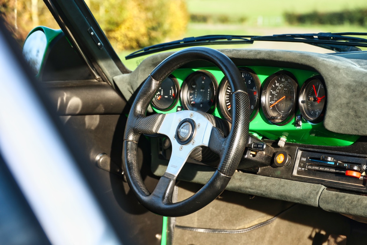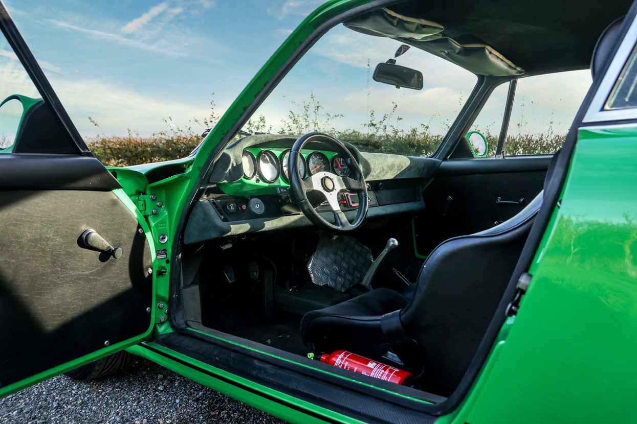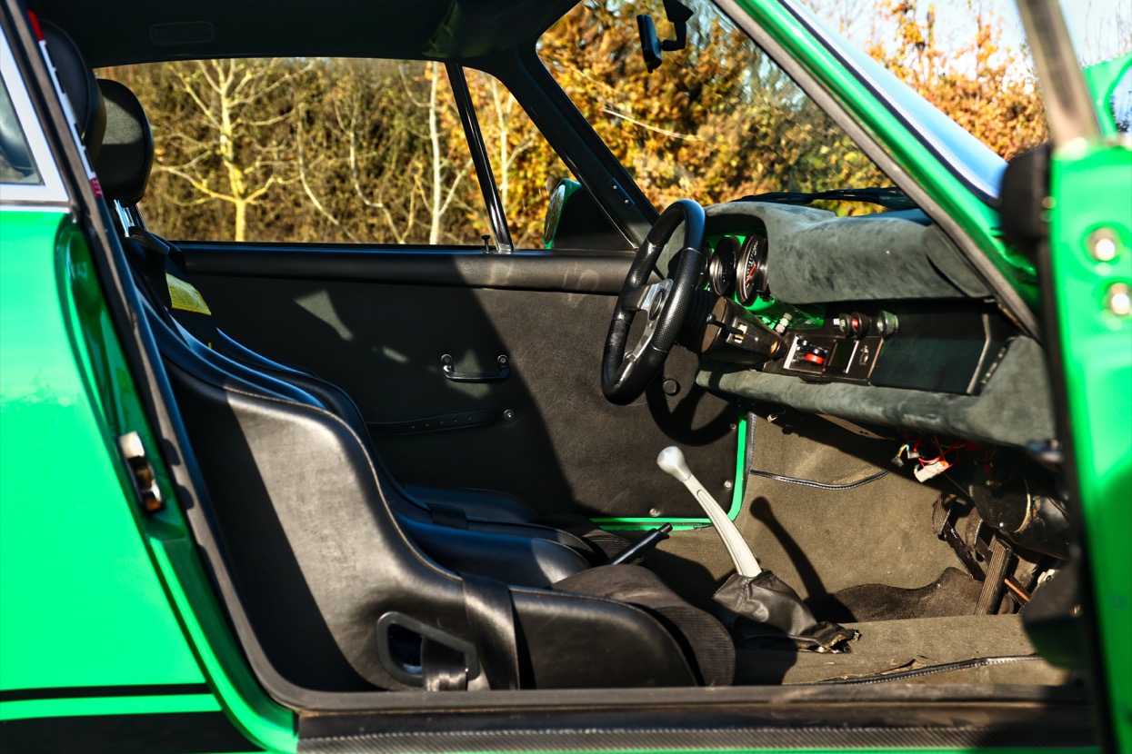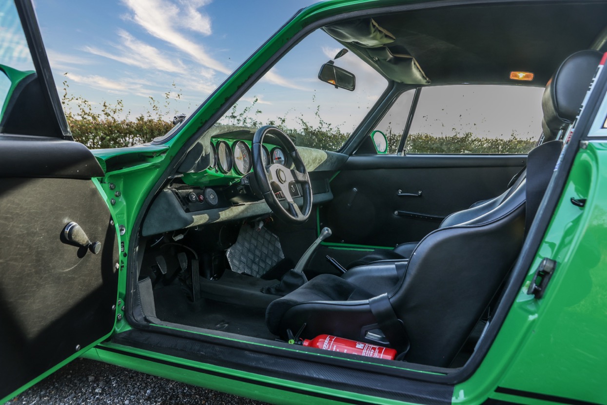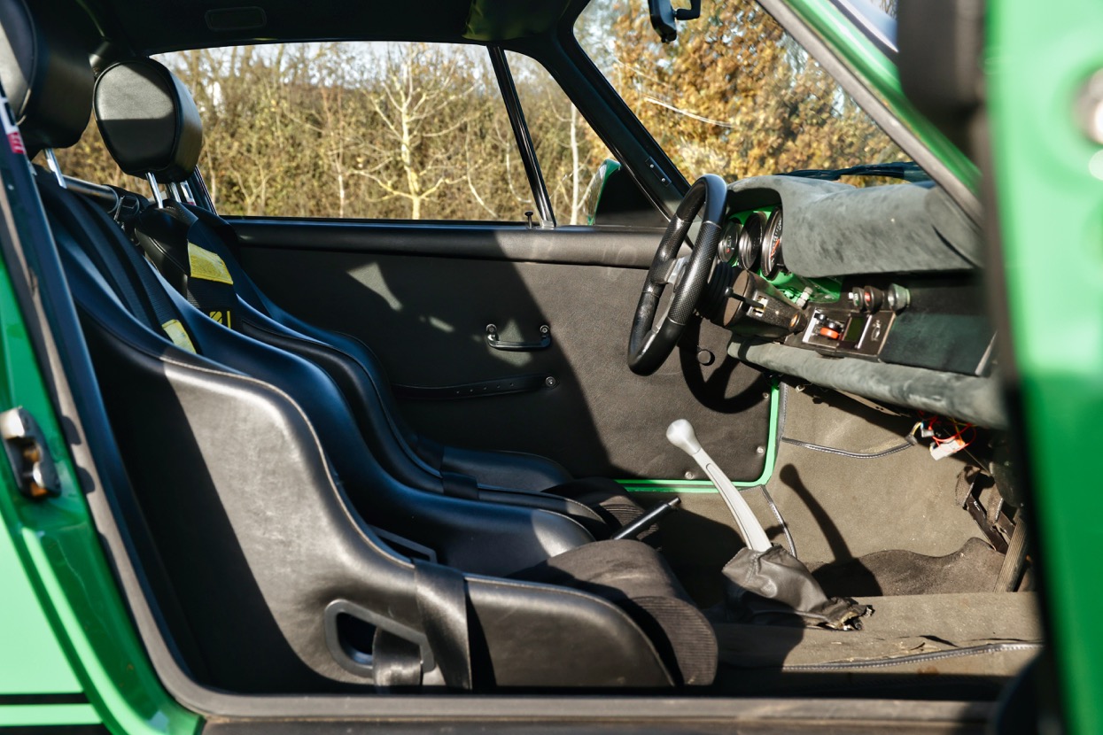 Works included removing the engine, gearbox and stripping the whole body, before replacing many of the panels with lightweight Kevlar or carbon panels before a respray in Viper Green. The original engine was replaced with a fully rebuilt 3.6 litre 964 unit running Jenvey throttle bodies and an OMEX electronic fuel injection system. This was mated to a close ratio quick shift G50 gearbox with a ZF limited slip differential along with upgraded brakes and suspension system. Other highlights include genuine 16” Fuchs alloys, Bonnet mounted driving lights, Bespoke exhaust system, FIA approved Heigo roll cage, Schruth harnesses, Heated windscreen. A period lightweight interior was installed which included Bielstein bucket seats, Alcantara trim and Momo steering wheel.