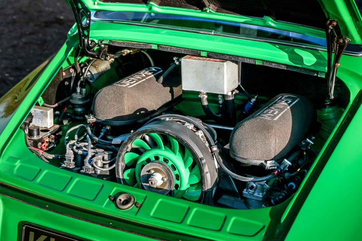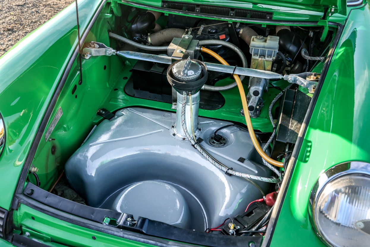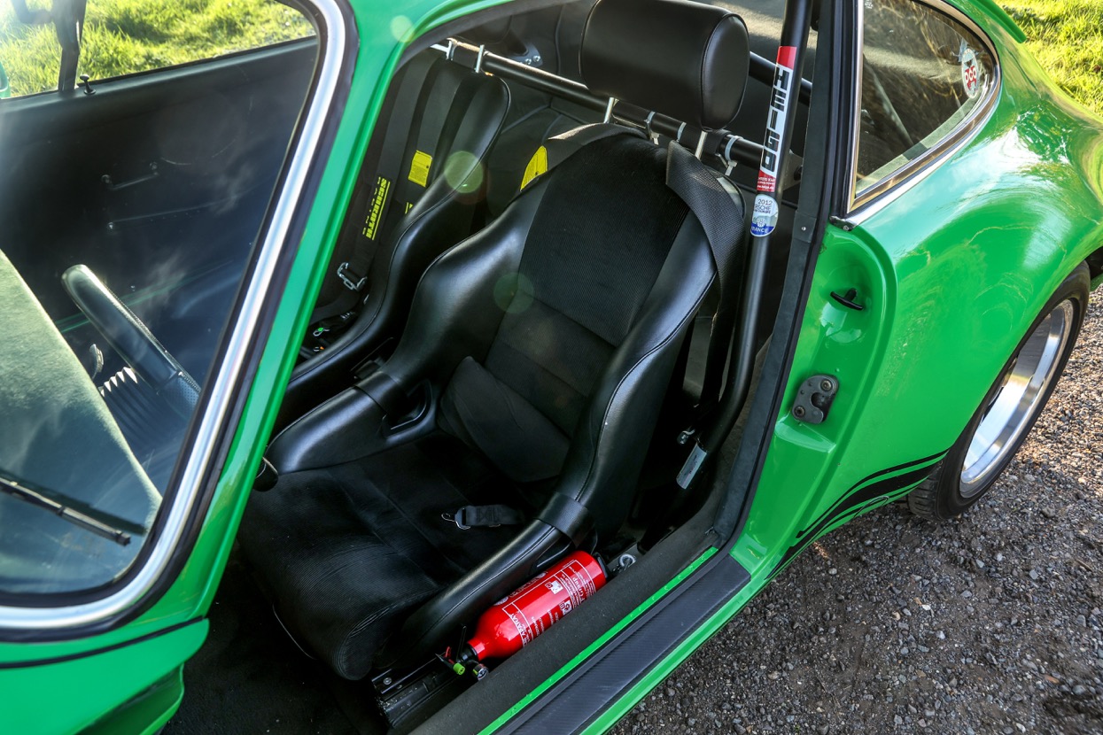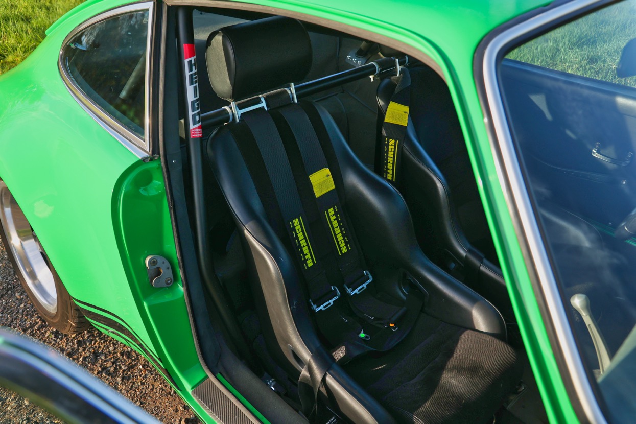 Works included removing the engine, gearbox and stripping the whole body, before replacing many of the panels with lightweight Kevlar or carbon panels before a respray in Viper Green. The original engine was replaced with a fully rebuilt 3.6 litre 964 unit running Jenvey throttle bodies and an OMEX electronic fuel injection system. This was mated to a close ratio quick shift G50 gearbox with a ZF limited slip differential along with upgraded brakes and suspension system. Other highlights include genuine 16” Fuchs alloys, Bonnet mounted driving lights, Bespoke exhaust system, FIA approved Heigo roll cage, Schruth harnesses, Heated windscreen. A period lightweight interior was installed which included Bielstein bucket seats, Alcantara trim and Momo steering wheel.
